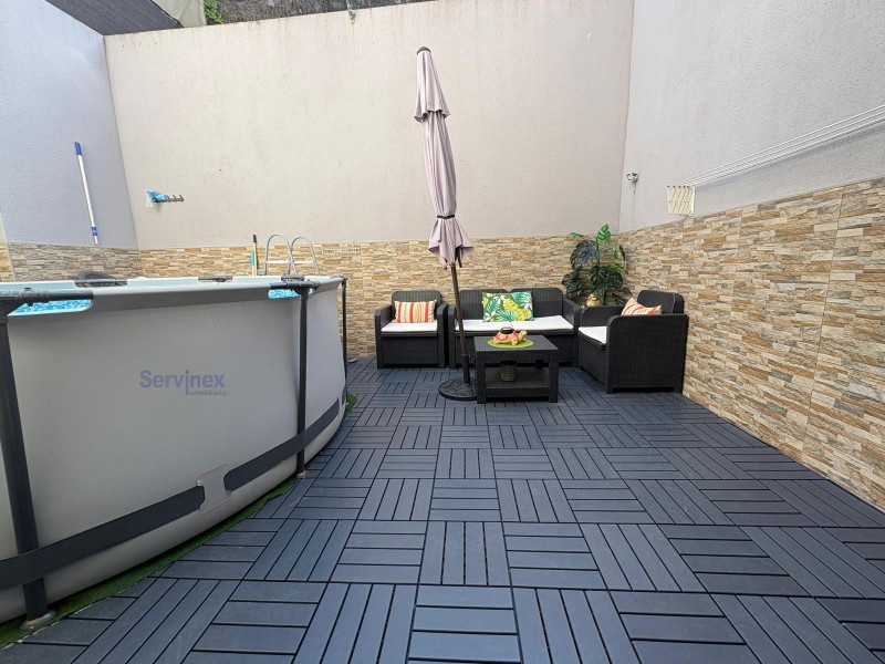 Gran salón con terraza, cocina con despensa, dormitorio, baño y patio con piscina en superficie en la primera planta.